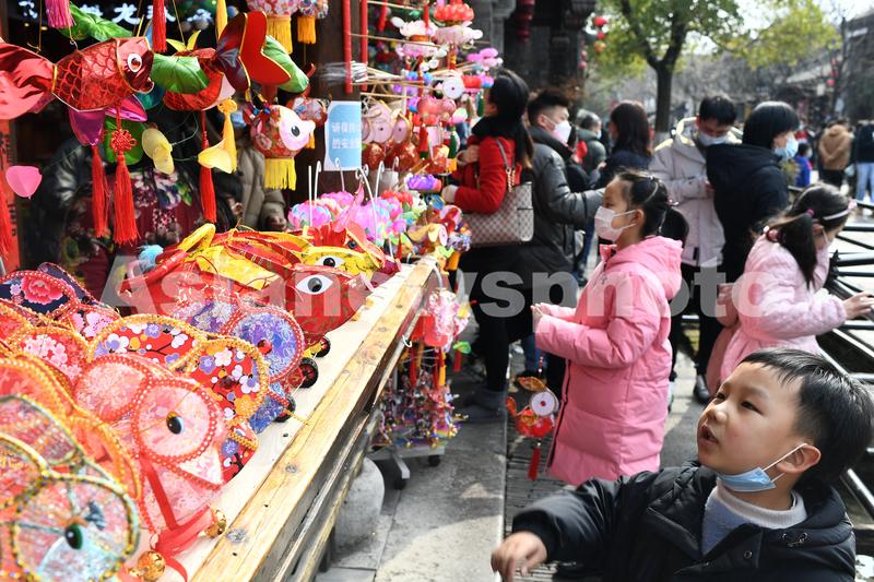 2021年2月15日,江苏南京夫子庙老门东景区内,秦淮花灯大批上市、捏泥人、做糖画等纷纷“上线”,吸引大批游客前来观赏游玩。