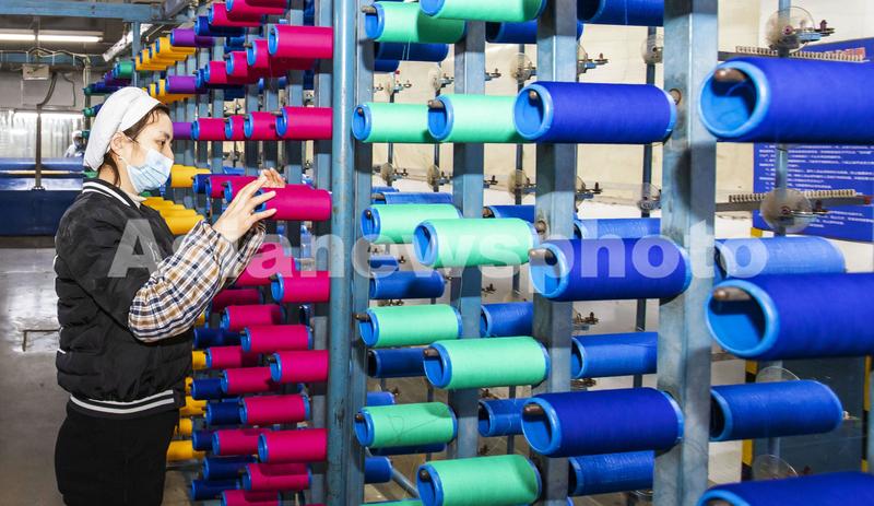 2021年2月18日,在江苏省海安市立发街道一家纺织公司内,工人在工作岗位上忙碌。