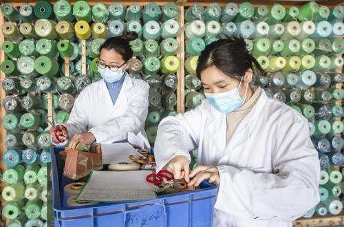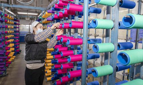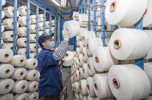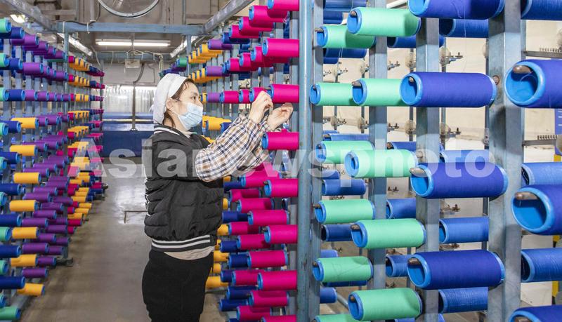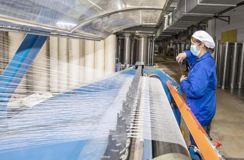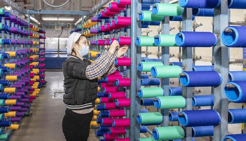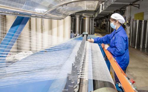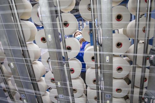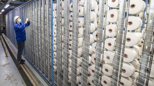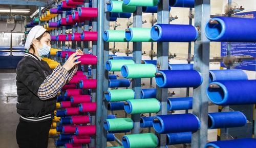 2021年2月18日,在江苏省海安市立发街道一家纺织公司内,工人在工作岗位上忙碌。