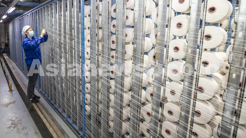 2021年2月18日,在江苏省海安市立发街道一家纺织公司内,工人在工作岗位上忙碌。
