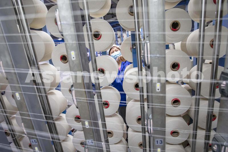 2021年2月18日,在江苏省海安市立发街道一家纺织公司内,工人在工作岗位上忙碌。