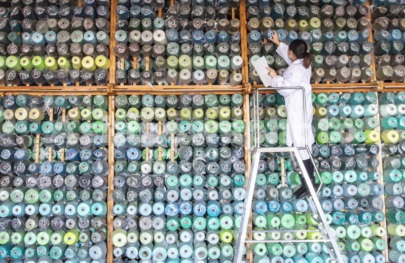 2021年2月18日,在江苏省海安市立发街道一家纺织公司内,工人在工作岗位上忙碌。