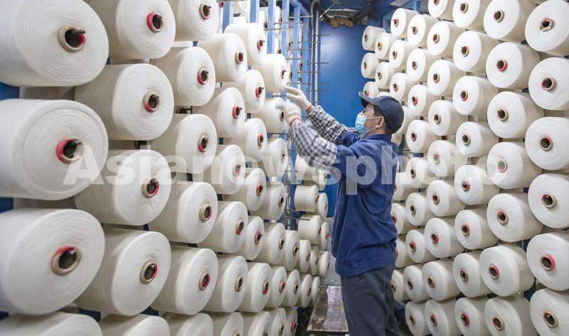 2021年2月18日,在江苏省海安市立发街道一家纺织公司内,工人在工作岗位上忙碌。