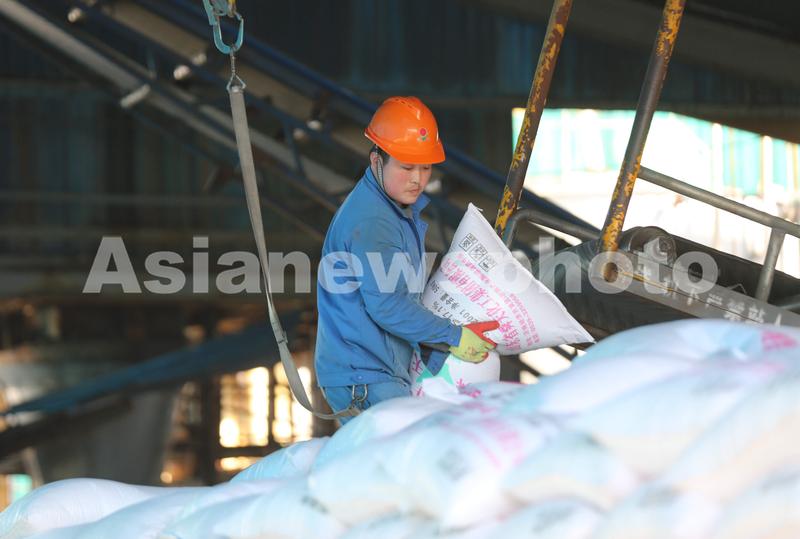 2021年2月19日,在山东省临沂市沂南县经济开发区一家化工集团作业场区,工人在装运化肥。