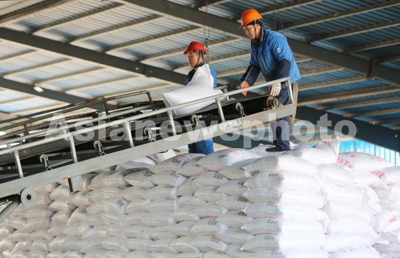 2021年2月19日,在山东省临沂市沂南县经济开发区一家化工集团作业场区,工人在装运化肥。