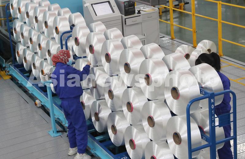 2021年2月18日拍摄的恒力(南通)纺织新材料产业园二期项目忙碌的生产车间。位于江苏南通通州区开沙岛的恒力(南通)纺织新材料产业园于2020年9月获评国家级“绿色工厂”。据介绍,四期项目全部建成后,纺织新材料产业园将成为全球单体产能最大、品种最全的纤维生产基地。