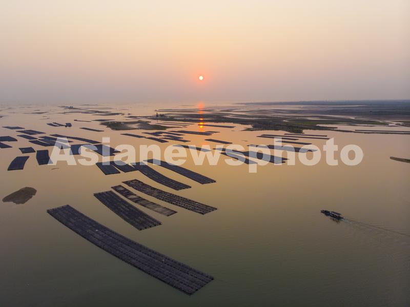 2021年2月19日,广西北海市合浦县烟楼村,落日辉映下的生蚝养殖场。