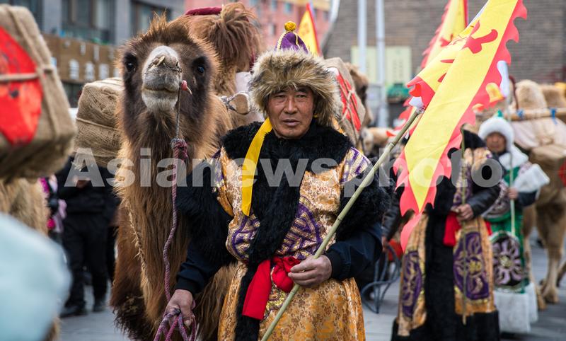 2021年2月23日,在内蒙古呼和浩特市玉泉区塞上老街,演员在商道“驼队”入城街头情景剧中表演。