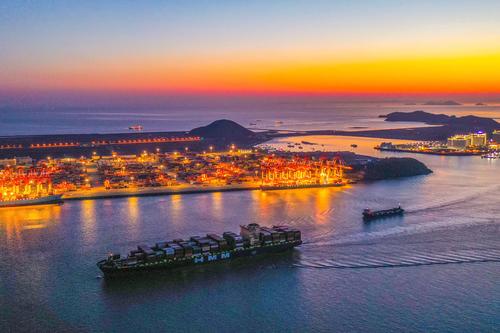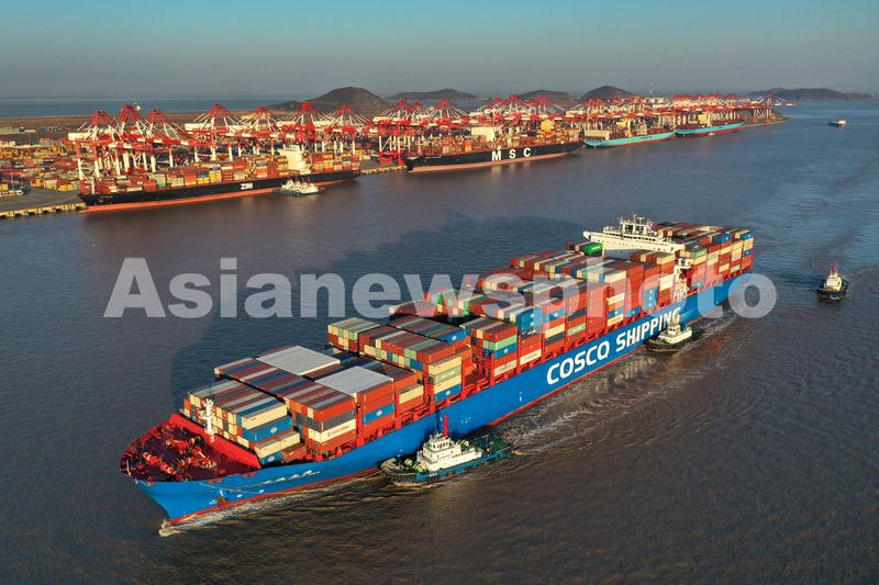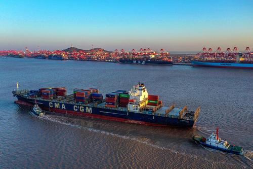 2021年2月20日傍晚,“中海南海”大型国际班线集装箱轮驶入上港集团洋山港,将靠泊该港区码头进行集装箱装卸作业。