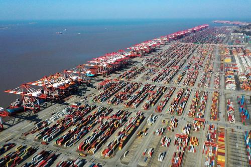 2021年2月20日傍晚与21日清晨,数艘大型国际航线集装箱轮先后驶入浙江省舟山市嵊泗县境内的洋山港,将靠泊该港区码头进行集装箱装卸作业。有数据显示,2020年上港集团洋山港区年集装箱吞吐量首超2000万标准箱。今年1月份,洋山港集装箱吞吐量以196.5万标准箱突破历史记录,同比增长17.8%。