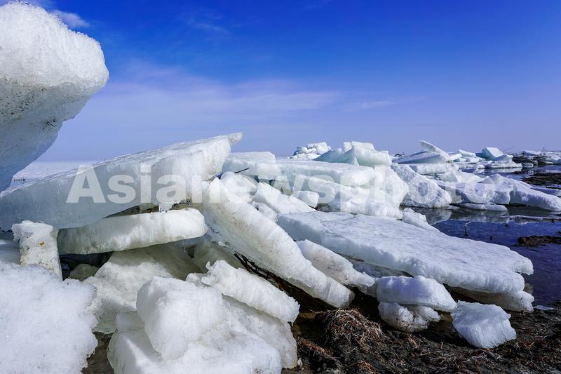 图片说明:2021年2月23日,位于新疆维吾尔自治区巴音郭楞蒙古自治州博湖县境内的博斯腾湖冰雪逐渐消融,大量的冰块在风的作用下堆积到岸边。