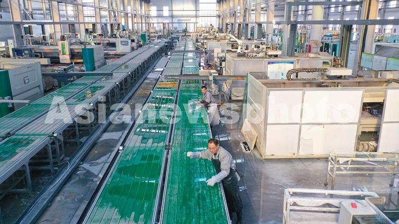 2021年2月24日,江苏省海安市开发区一家玻璃公司员工在生产线上生产用于汽车、电器使用的配套玻璃产品。