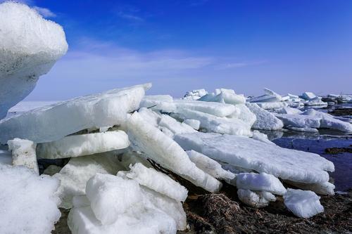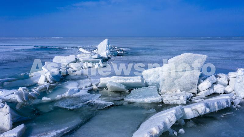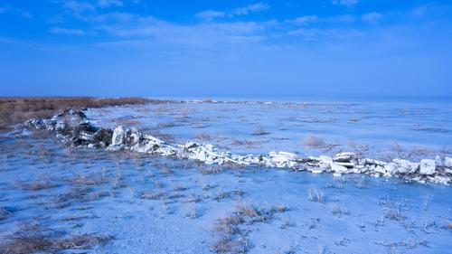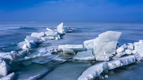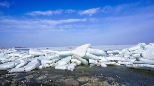 图片说明:2021年2月23日,位于新疆维吾尔自治区巴音郭楞蒙古自治州博湖县境内的博斯腾湖冰雪逐渐消融,大量的冰块在风的作用下堆积到岸边。