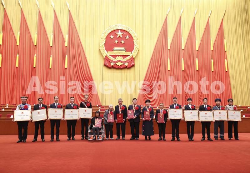 图片说明:2021年2月25日,在北京人民大会堂举行的全国脱贫攻坚总结表彰大会上,全国脱贫攻坚楷模荣誉称号获得者合影留念。