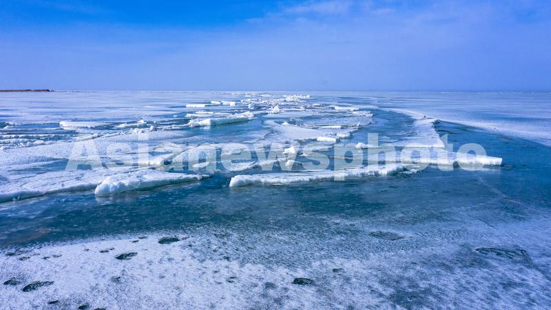图片说明:2021年2月23日,位于新疆维吾尔自治区巴音郭楞蒙古自治州博湖县境内的博斯腾湖冰雪逐渐消融,大量的冰块在风的作用下堆积到岸边。