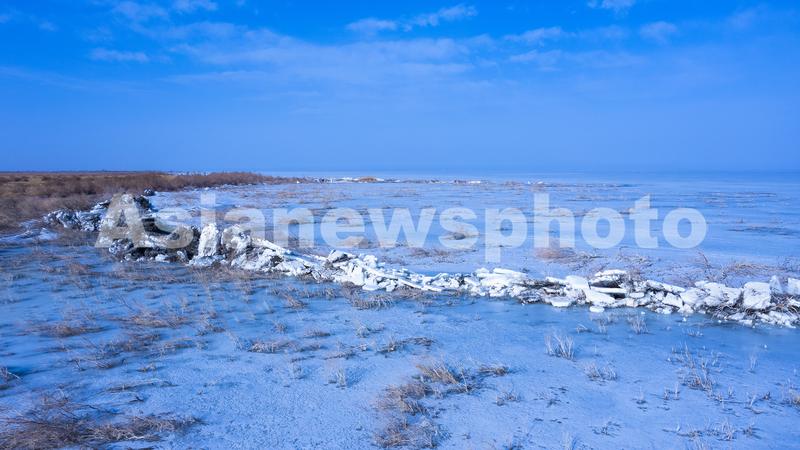 图片说明:2021年2月23日,位于新疆维吾尔自治区巴音郭楞蒙古自治州博湖县境内的博斯腾湖冰雪逐渐消融,大量的冰块在风的作用下堆积到岸边。