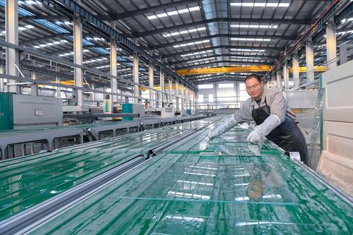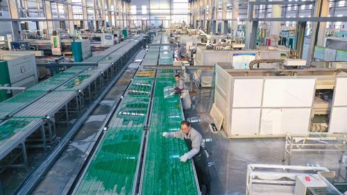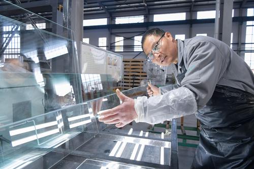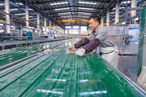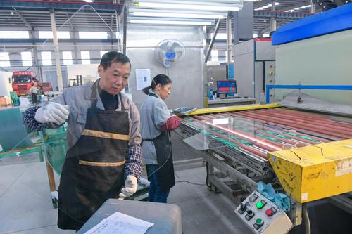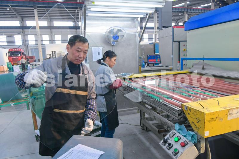 2021年2月24日,江苏省海安市开发区一家玻璃公司员工在生产线上生产用于汽车、电器使用的配套玻璃产品。