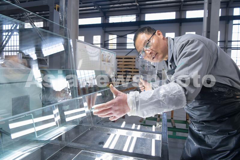 2021年2月24日,江苏省海安市开发区一家玻璃公司员工在生产线上生产用于汽车、电器使用的配套玻璃产品。