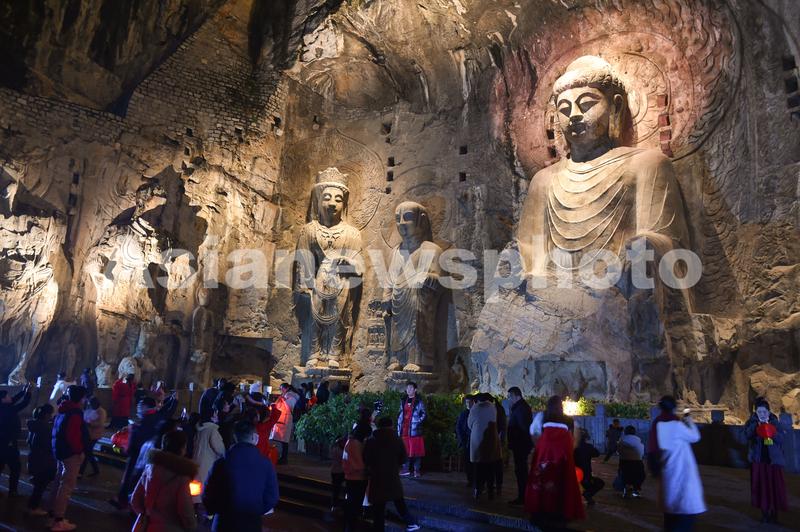 2020年2月25日晚,河南洛阳,世界文化遗产洛阳龙门石窟处处张灯结彩,节日氛围浓厚。据悉,景区在正月十四至十七期间开展“送宫灯、着汉服免费游、猜灯谜”等多项“夜游龙门”优惠活动。