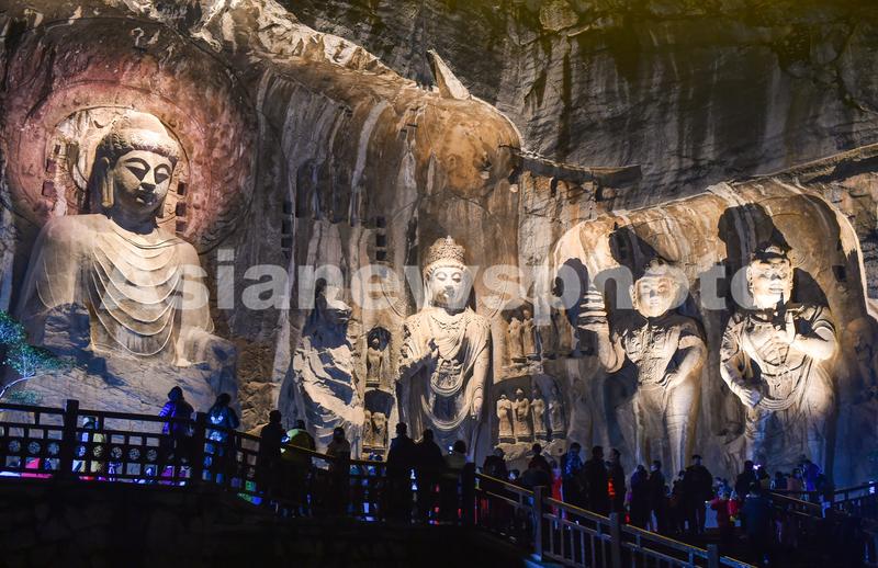 2020年2月25日晚,河南洛阳,游客“夜游”龙门石窟。