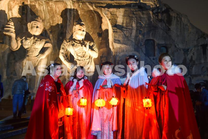 2020年2月25日晚,河南洛阳,穿汉服的游客“夜游”龙门石窟。