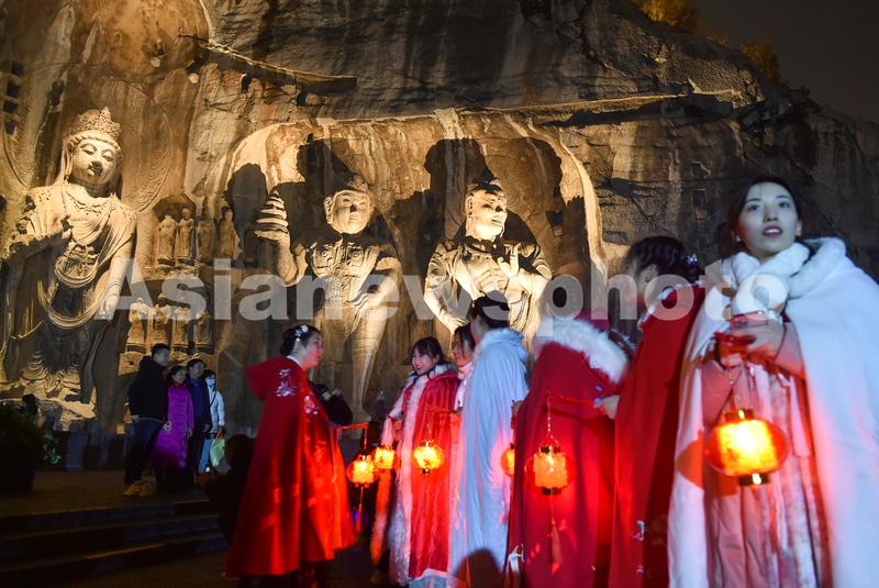 2020年2月25日晚,河南洛阳,世界文化遗产洛阳龙门石窟处处张灯结彩,节日氛围浓厚。据悉,景区在正月十四至十七期间开展“送宫灯、着汉服免费游、猜灯谜”等多项“夜游龙门”优惠活动。