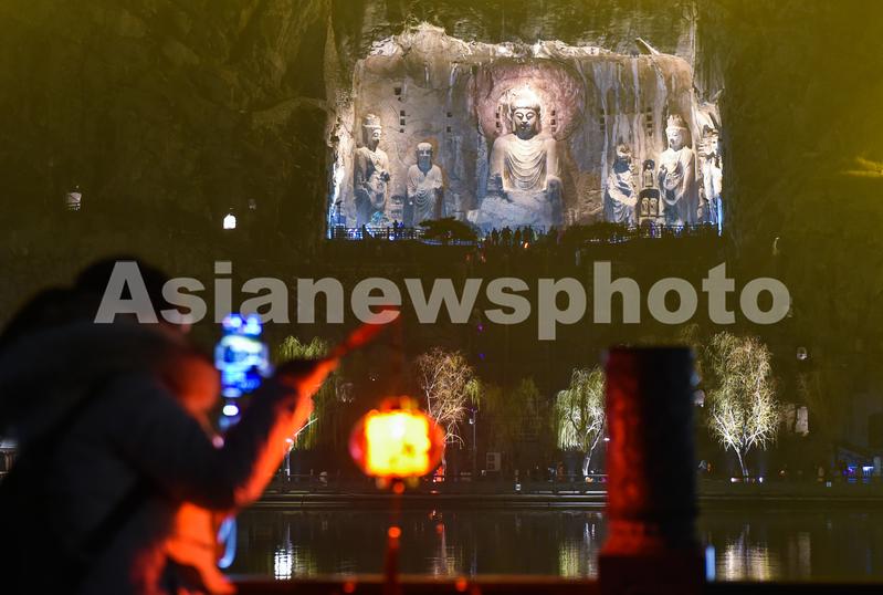 2020年2月25日晚,河南洛阳,游客“夜游”龙门石窟。