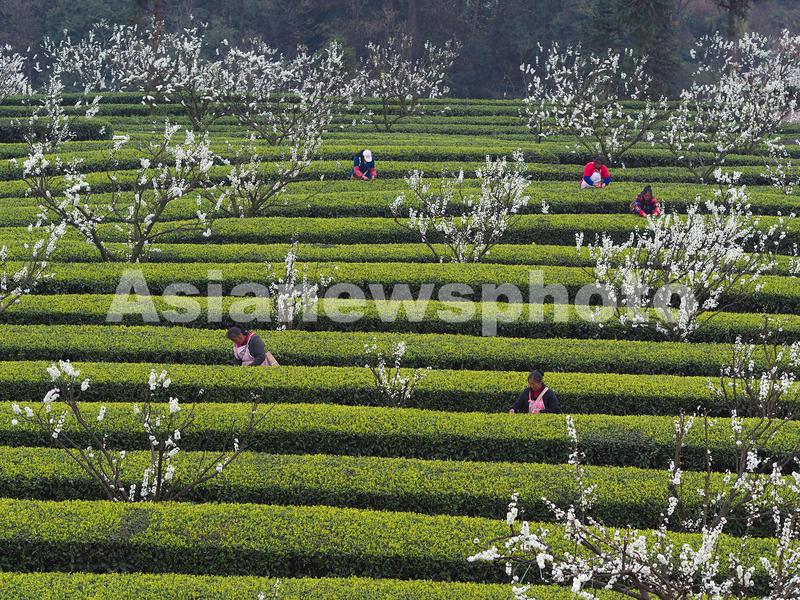 图片说明:3月4日,四川省宜宾市屏山县锦屏镇锦屏山,茶农在梯田茶海中忙碌,不时有专程前来赏花的游人。