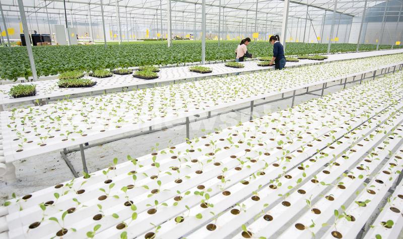 图片说明:3月7日,在福建省泉州市永春县岵山镇现代农业示范基地的“智慧温室”大棚内,工人将菜苗移植到水培蔬菜种植管道内。