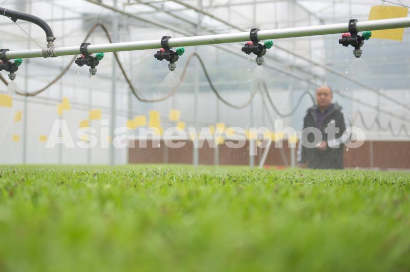 图片说明:3月7日,在福建省泉州市永春县岵山镇现代农业示范基地的“智慧温室”大棚内,工人利用遥控移动喷灌车给蔬菜浇水。
