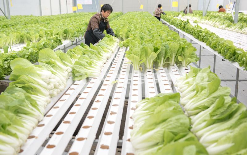 图片说明:3月7日,在福建省泉州市永春县岵山镇现代农业示范基地的“智慧温室”大棚内,工人在采摘水培蔬菜。
