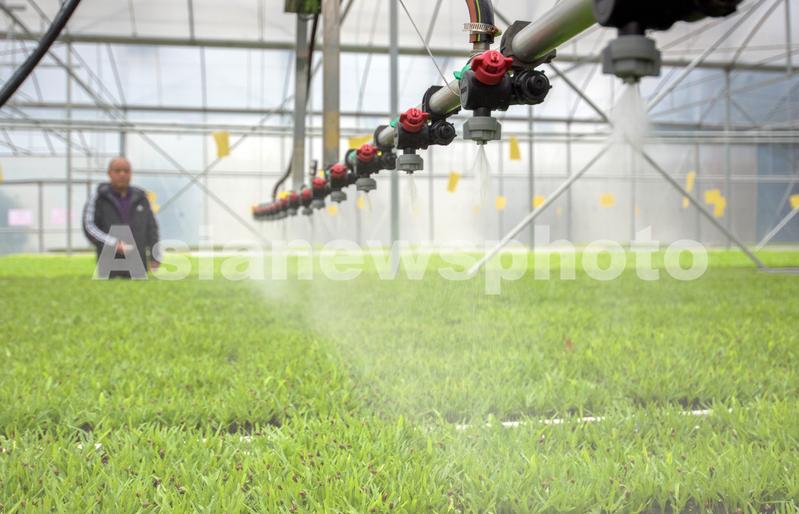 图片说明:3月7日,在福建省泉州市永春县岵山镇现代农业示范基地的“智慧温室”大棚内,工人利用遥控移动喷灌车给蔬菜浇水。