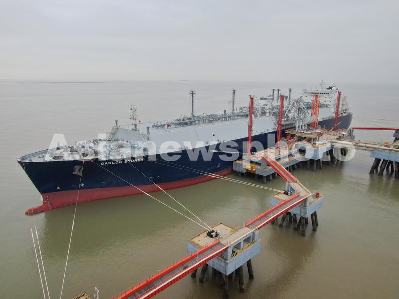 图片说明:2021年3月9日,江苏启东吕四港经济开发区,广汇能源LNG接收站码头在接卸来自埃及的6万吨LNG。