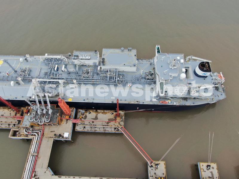 图片说明:2021年3月9日,江苏启东吕四港经济开发区,广汇能源LNG接收站码头在接卸来自埃及的6万吨LNG。
