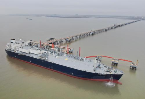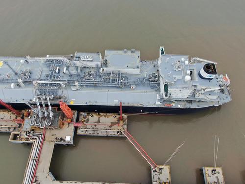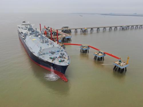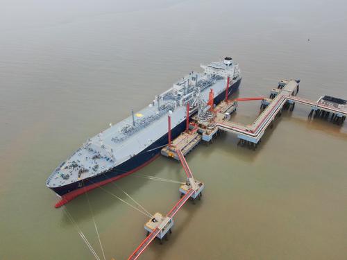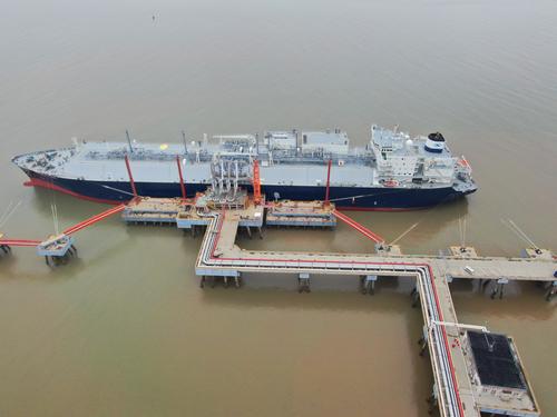 图片说明:2021年3月9日,江苏启东吕四港经济开发区,广汇能源LNG接收站码头在接卸来自埃及的6万吨LNG。