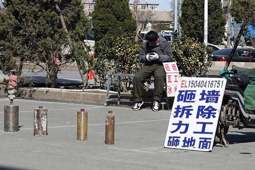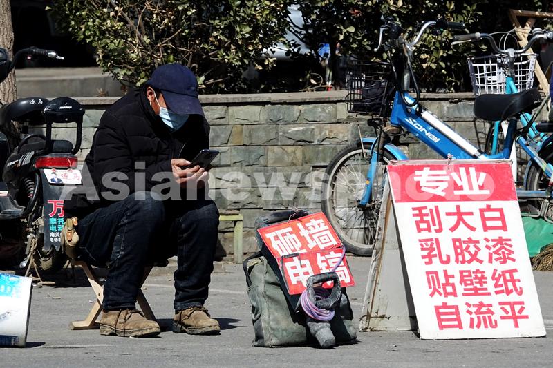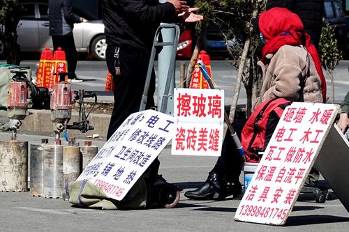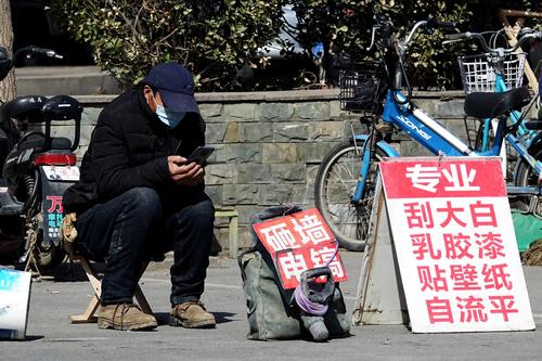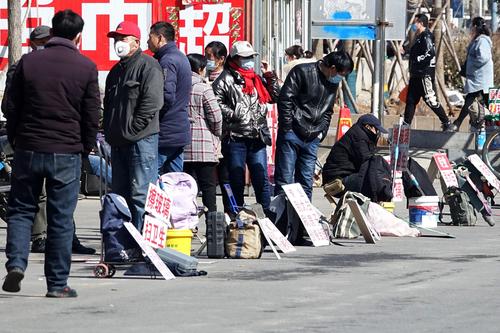 图片说明:2021年3月16日,辽宁大连市甘井子区一大型市场外,农民工们守候在马路边寻找工作。
