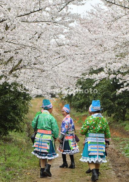 3月13日,贵州省安顺市西秀区黄腊乡占地5000亩的樱花园里,当地少数民族妇女在游园赏花。