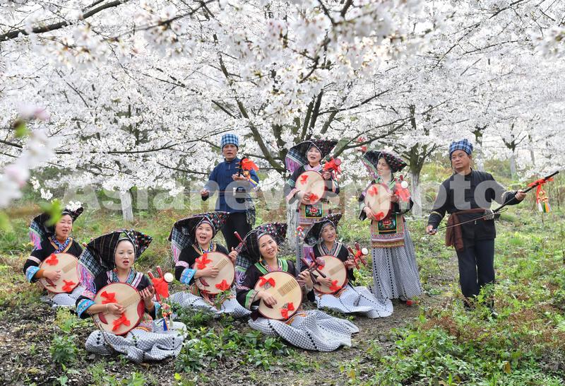 3月13日,贵州省安顺市西秀区黄腊乡占地5000亩的樱花园里,文艺爱好者在演奏省级非遗文化布依族盘江小调。