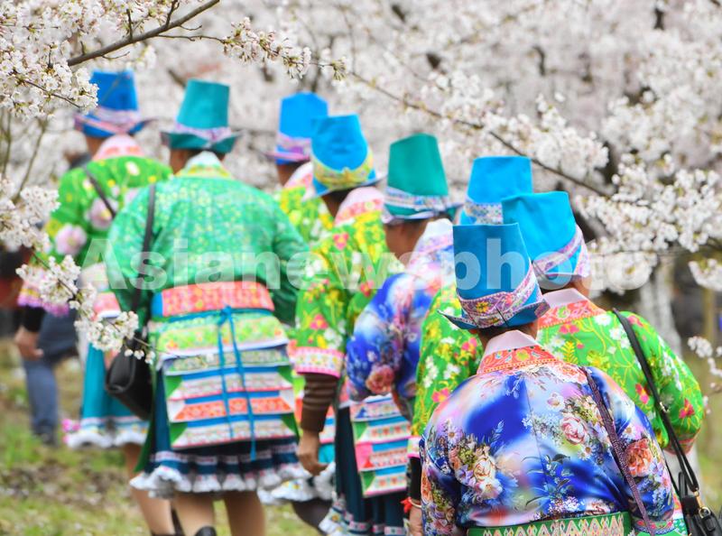 3月13日,贵州省安顺市西秀区黄腊乡占地5000亩的樱花园里,当地少数民族妇女在游园赏花。