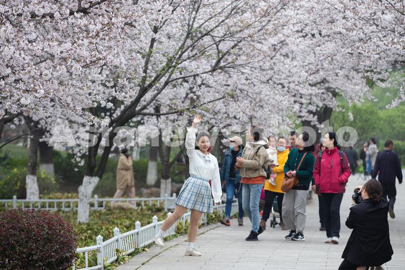 2021年3月16日,春日的南京玄武湖景区樱花盛开,吸引游人前来赏花游览。