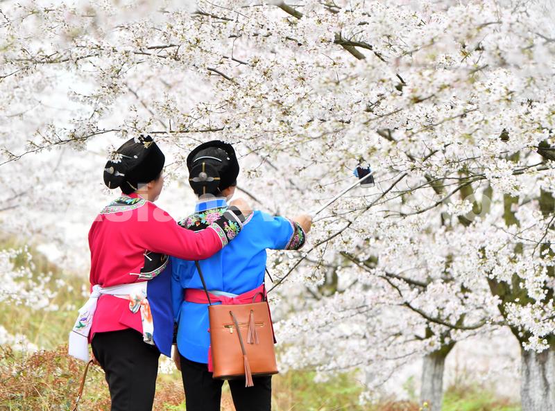 3月13日,贵州省安顺市西秀区黄腊乡占地5000亩的樱花园里,当地布依族妇女在自拍留念。
