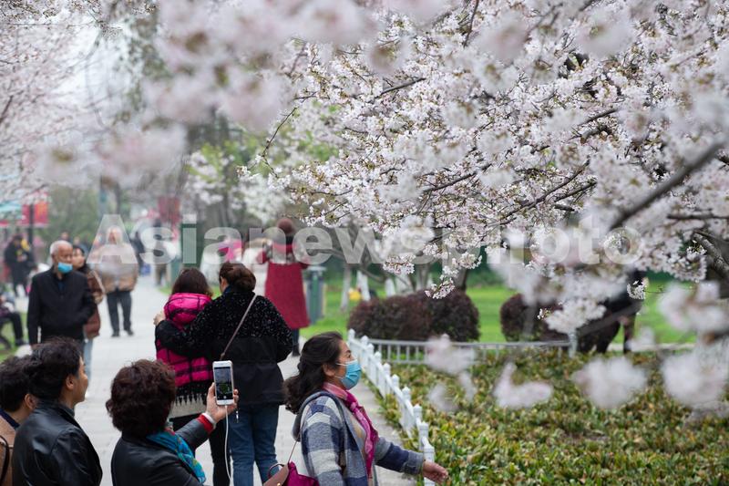2021年3月16日,春日的南京玄武湖景区樱花盛开,吸引游人前来赏花游览。