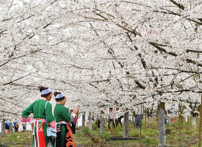 3月13日,贵州省安顺市西秀区黄腊乡占地5000亩的樱花园里,当地屯堡妇女在游园赏花。