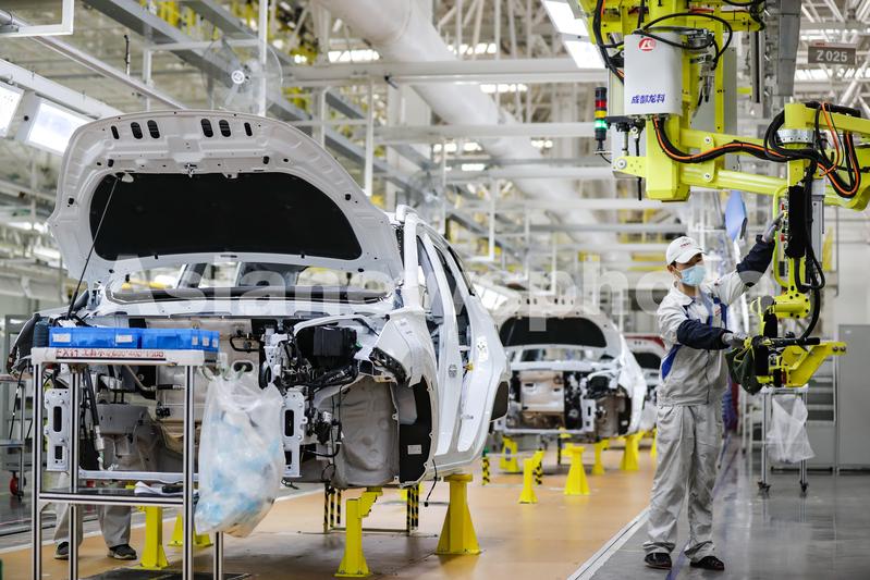 图片说明:2021年3月18日,在四川省宜宾三江新区宜宾凯翼汽车有限公司总装车间,工人在智慧生产线上忙碌。