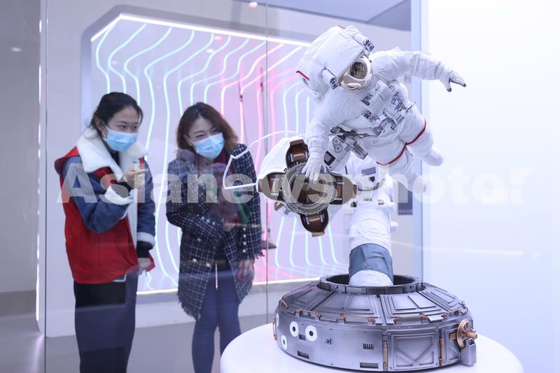 2021年3月19日,北京,观众在中国科技馆参观“从这里飞向太空——庆祝建党100周年中国载人航天互动科普展”,该展览于3月18日在京开幕。展览设置“时光隧道”“为梦而战”“圆梦太空”“太空家园”等展区,呈现中国载人航天发展历程,并采用最新的机电互动、裸眼3D、虚拟现实等互动体验项目,让公众亲身体验航天员选拔训练、发射过程、在轨生活和返回过程。