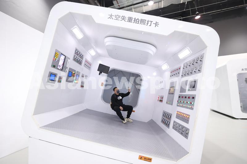 2021年3月19日,观众在太空失重体验区拍照打卡。