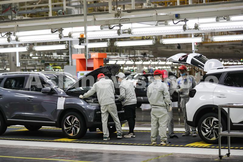 图片说明:2021年3月18日,在四川省宜宾三江新区宜宾凯翼汽车有限公司总装车间,工人在智慧生产线上忙碌。