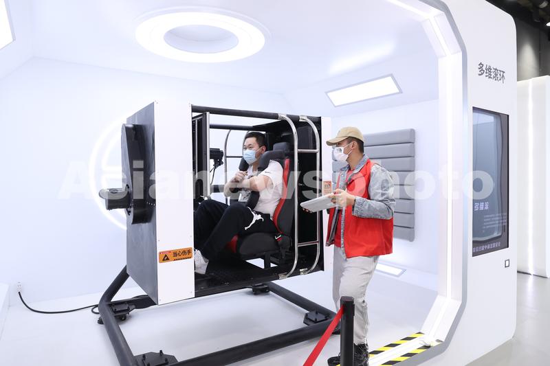 2021年3月19日,北京,观众在中国科技馆参观“从这里飞向太空——庆祝建党100周年中国载人航天互动科普展”,该展览于3月18日在京开幕。展览设置“时光隧道”“为梦而战”“圆梦太空”“太空家园”等展区,呈现中国载人航天发展历程,并采用最新的机电互动、裸眼3D、虚拟现实等互动体验项目,让公众亲身体验航天员选拔训练、发射过程、在轨生活和返回过程。