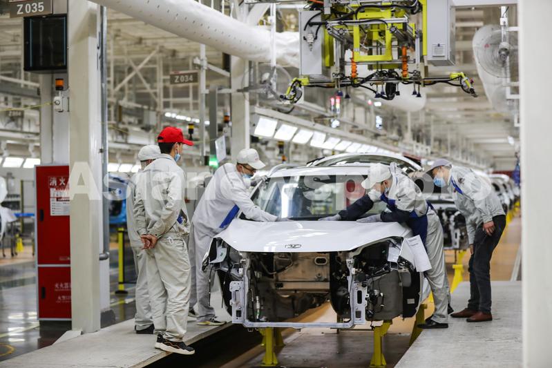 图片说明:2021年3月18日,在四川省宜宾三江新区宜宾凯翼汽车有限公司总装车间,工人在智慧生产线上忙碌。
