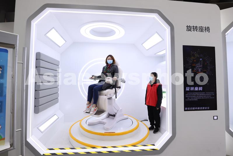 2021年3月19日,北京,观众在中国科技馆参观“从这里飞向太空——庆祝建党100周年中国载人航天互动科普展”,该展览于3月18日在京开幕。展览设置“时光隧道”“为梦而战”“圆梦太空”“太空家园”等展区,呈现中国载人航天发展历程,并采用最新的机电互动、裸眼3D、虚拟现实等互动体验项目,让公众亲身体验航天员选拔训练、发射过程、在轨生活和返回过程。